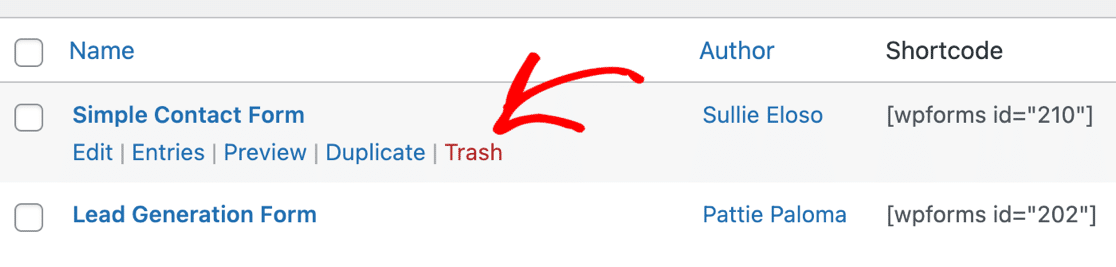 Jeśli chcesz całkowicie usunąć formularz ze swojej witryny, możesz przejść do Kosza formularzy i trwale go usunąć.