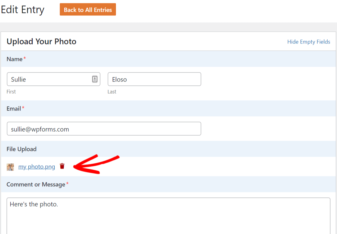 Wcześniej WPForms nie pozwalało na usuwanie załączników plików z zarządzania wpisami. Ale usłyszeliśmy Twoją prośbę i cieszymy się, że WPForms umożliwia teraz usuwanie plików przesłanych przez użytkowników.