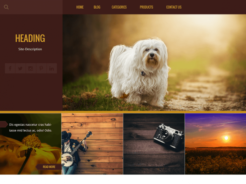 - Uma imagem no cabeçalho, um slider com dois modos de demonstração de conteúdo.