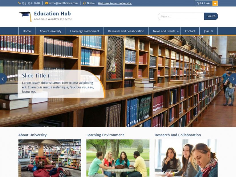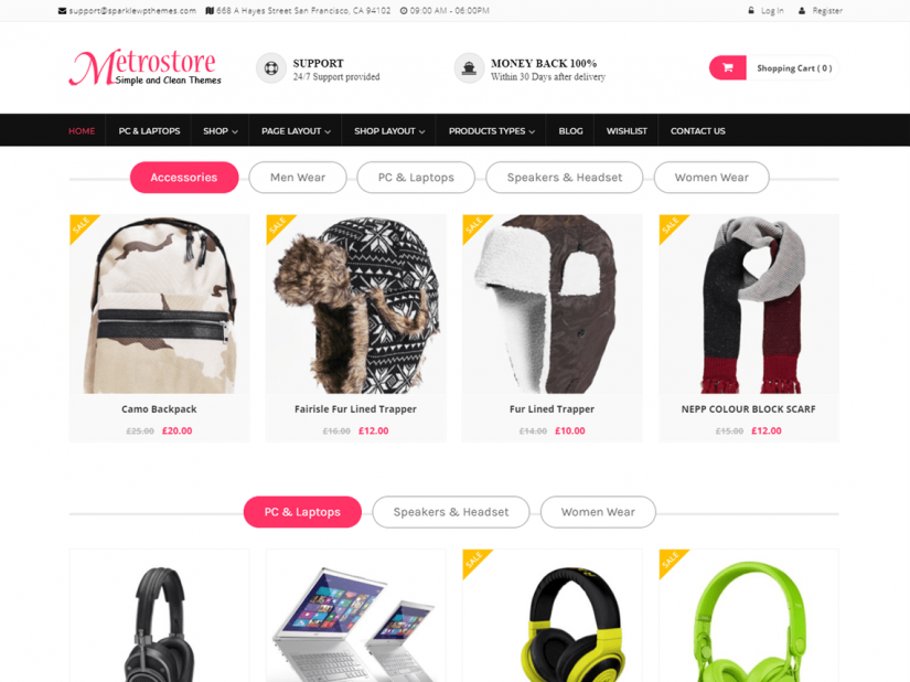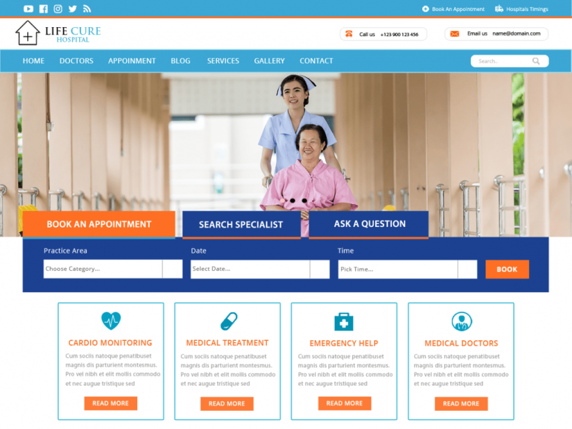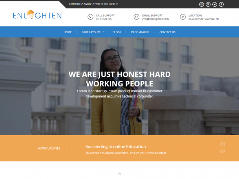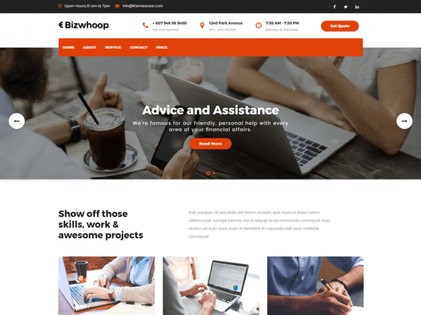 - A escolha do layout da página, três formatos de slider, configurações de tipografia, informações de contato no cabeçalho.