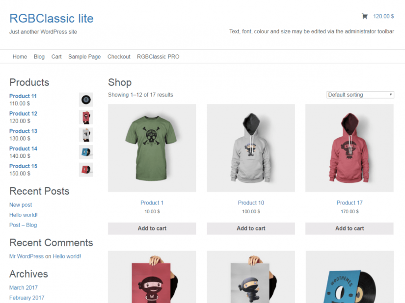 - A capacidade de adicionar uma imagem no cabeçalho, uma zona de widgets no rodapé.
