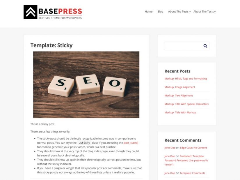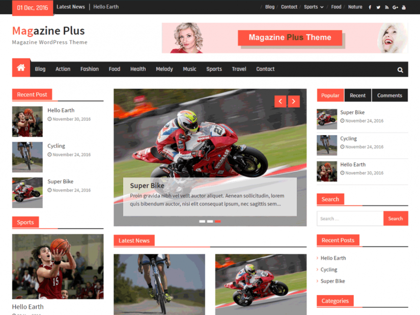 - Há uma opção de barra lateral, postagens relacionadas, um widget social Siga-me.
