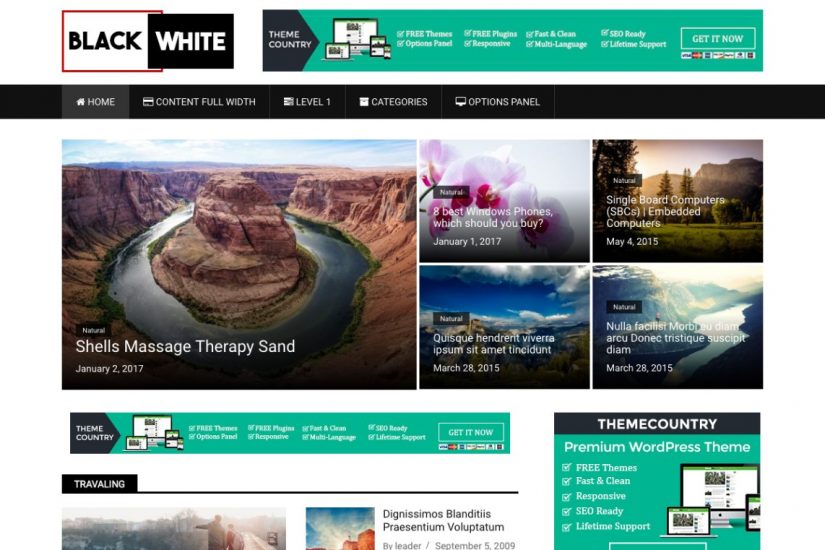 - Seis zonas de widgets, a capacidade de adicionar uma imagem no cabeçalho, a escolha da barra lateral direita e esquerda, o layout sem a barra lateral.
