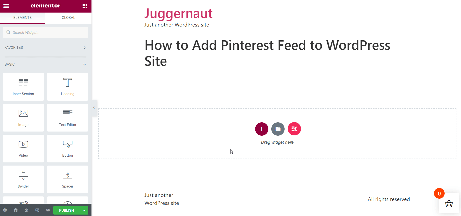 Agora, você está na janela do Elementor. Neste ponto, vá para o painel do lado esquerdo e encontre o widget do Pinterest. Basta arrastar e soltar o widget na área designada.