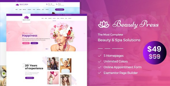 Você achará fácil construir um site de spa e salão de massagem com o tema Beauty Press. Vale a pena notar que o Beauty Press é um tema WordPress rico em recursos que tem tudo o que um site de spa e salão de massagem precisa. O tema vem com 5 layouts de página inicial exclusivos, cores ilimitadas, construtor de páginas de front-end Elementor, formulário de compromisso on-line, mapa do Google, formulário de contato, mega menu, ícones de beleza premium, poderoso sistema de reservas, feeds de calendário e muitos outros recursos excelentes. Beauty Press é um tema WordPress fácil de personalizar.