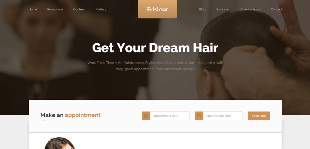 Frisieur é um WordPress moderno com um excelente sistema de agendamento acima da dobra para ajudá-lo a aumentar suas reservas. Se você adora modelos de uma página que são realmente populares em 2015, então você vai adorar o Fraisier. Os destaques deste tema incluem o construtor de página inicial para ajudá-lo a criar algo único e personalizar as necessidades da sua marca. Outros recursos incluem páginas de galeria personalizadas para mostrar seu trabalho anterior.