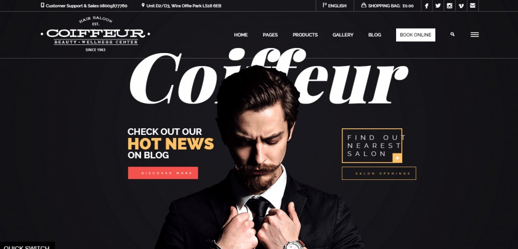 Coiffeur é um dos meus favoritos pessoais e exala elegância. Com seis layouts de página inicial predefinidos, você certamente encontrará algo que atenda às necessidades de sua marca. Os destaques deste tema para mim são o alternador de idiomas, páginas personalizadas para agendar um portfólio de compromissos e muito mais.