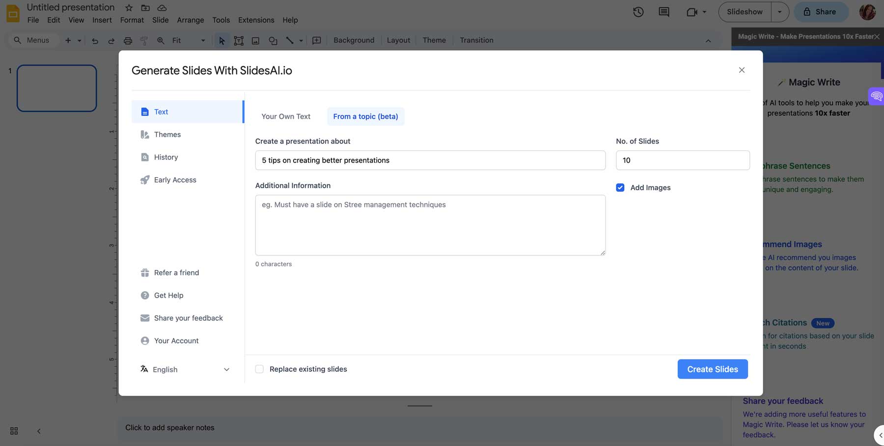 Slides AI é uma extensão do Chrome projetada para funcionar dentro do Apresentações Google. Forneça um tópico, incluindo todos os elementos solicitados, e o Slides AI criará uma apresentação de até 10 páginas em minutos. Existem recursos limitados, mas adiciona slides, gera texto e define a formatação com base no seu prompt. Além de gerar slides, o Slides AI possui o recurso Magic Write, que permite parafrasear frases, sugerir imagens para suas apresentações e ajuda a buscar citações para seu trabalho.