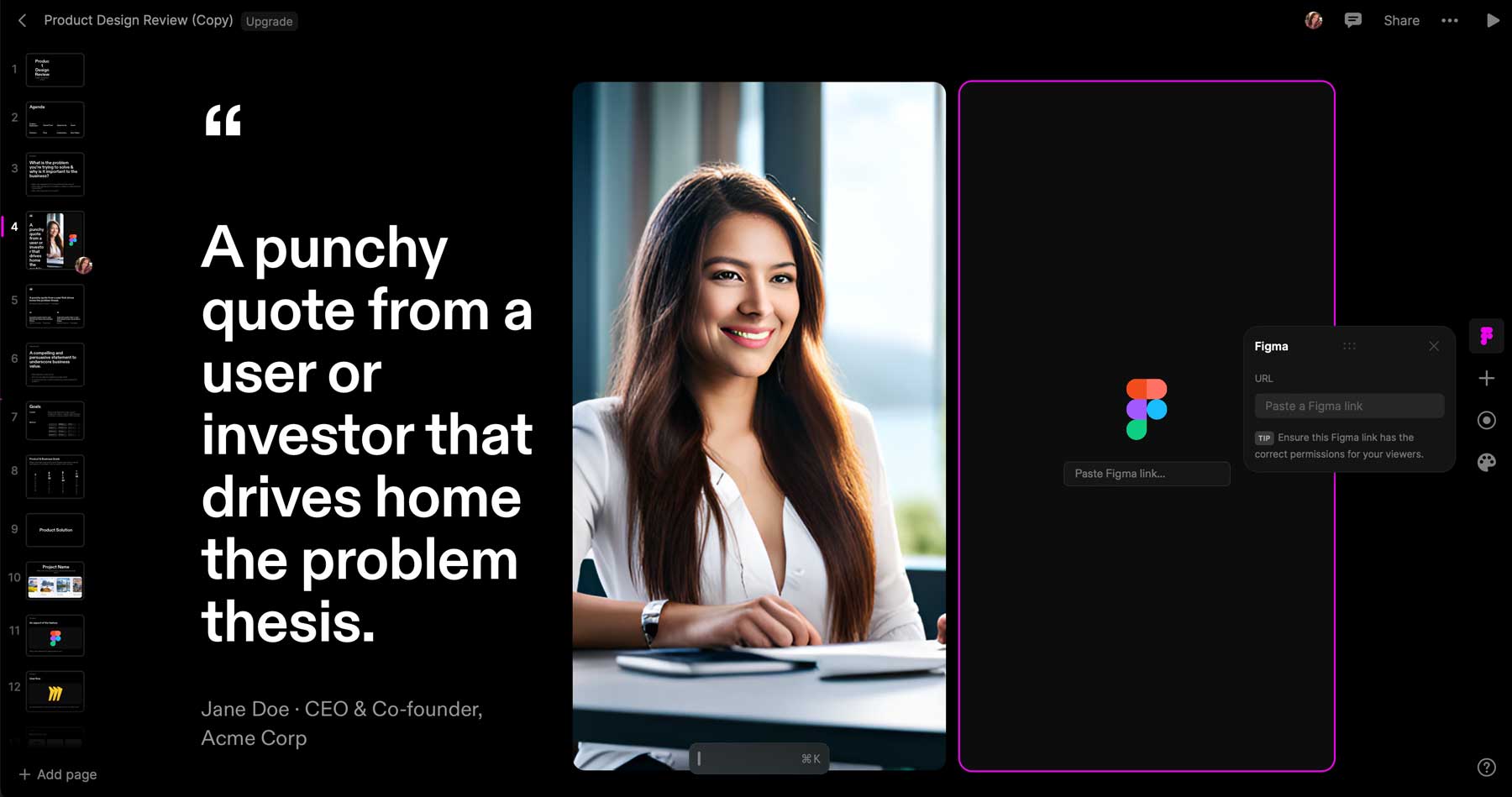 Tome é uma excelente plataforma para criar apresentações baseadas na web, landing pages, apresentações interativas e muito mais. Ele faz um bom trabalho de geração de texto e imagem, mas suas integrações são os melhores recursos. Experimente o Tome se quiser uma maneira fácil de incorporar layouts Figma ou vídeos do YouTube em suas apresentações.