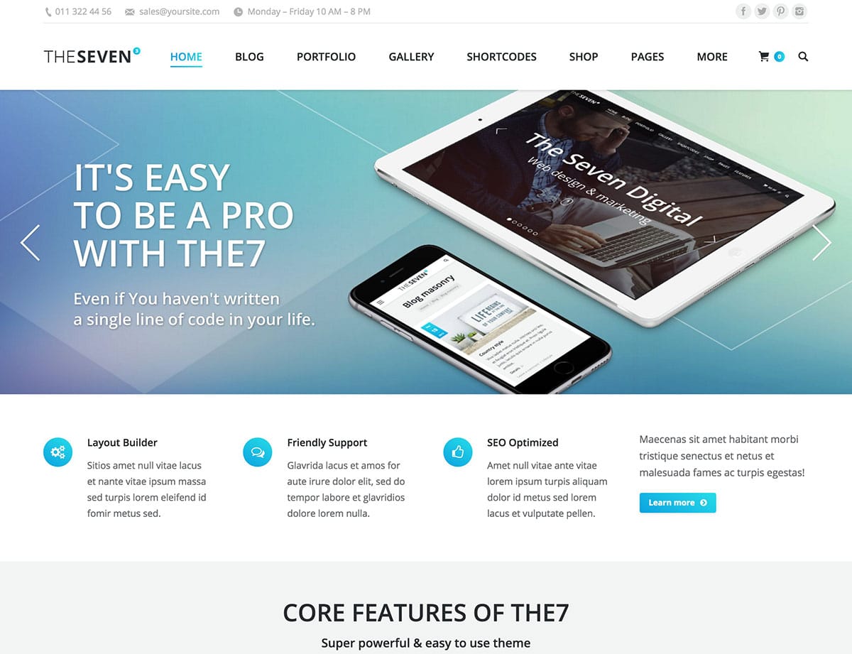 Toneladas de opções e estilos de códigos de acesso permitem que você crie seu site para atender aos seus gostos individuais. Se você deseja funcionalidade de paralaxe, um design de estilo de página de destino ou um layout mais direto, tudo é possível com o The7.