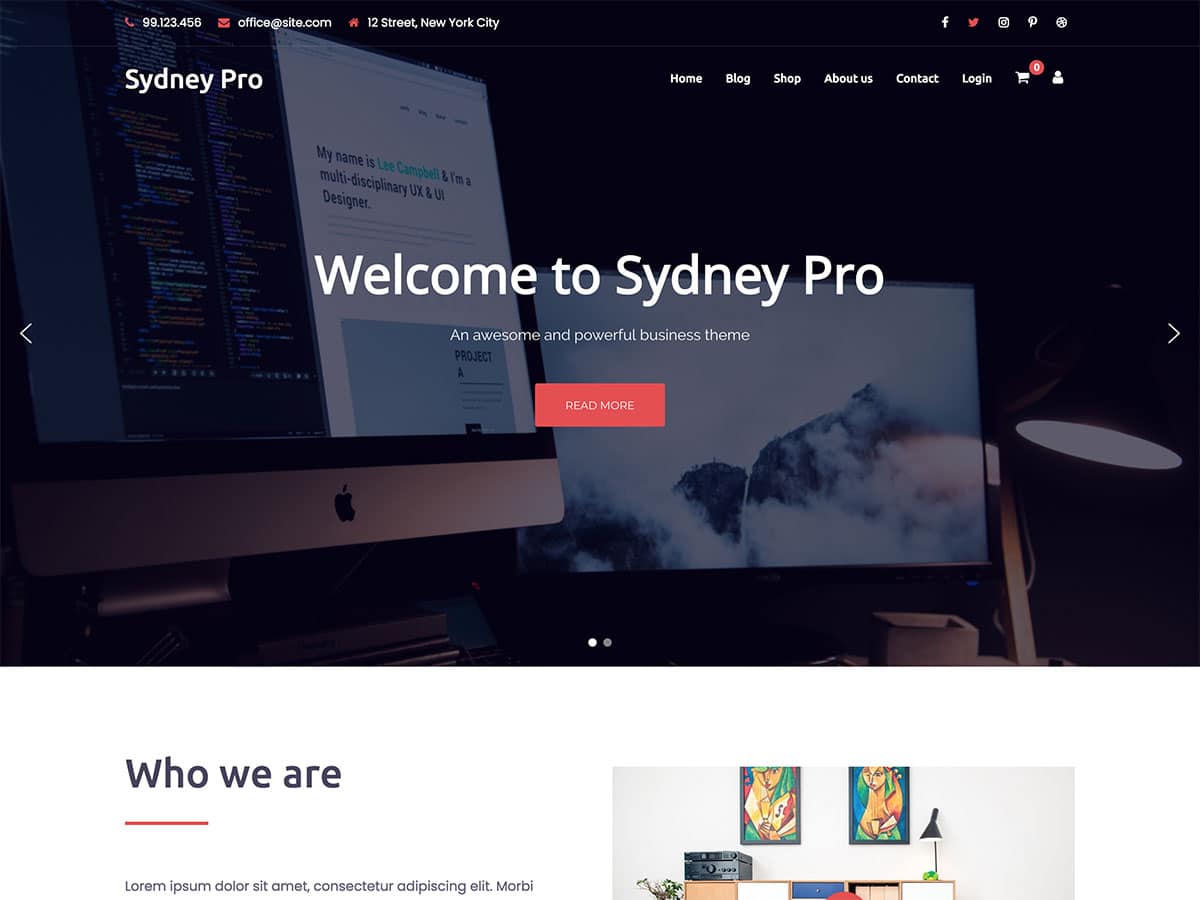 A barra de cabeçalho aderente do Sydney Pro permite uma navegação rápida entre as páginas, não importa o quão baixo você tenha rolado, o que é um impulso apreciado para a experiência do usuário. Por fim, os ícones de mídia social e a disponibilidade de tradução tornam o Sydney Pro uma opção fantástica para compartilhar seu site com qualquer pessoa.