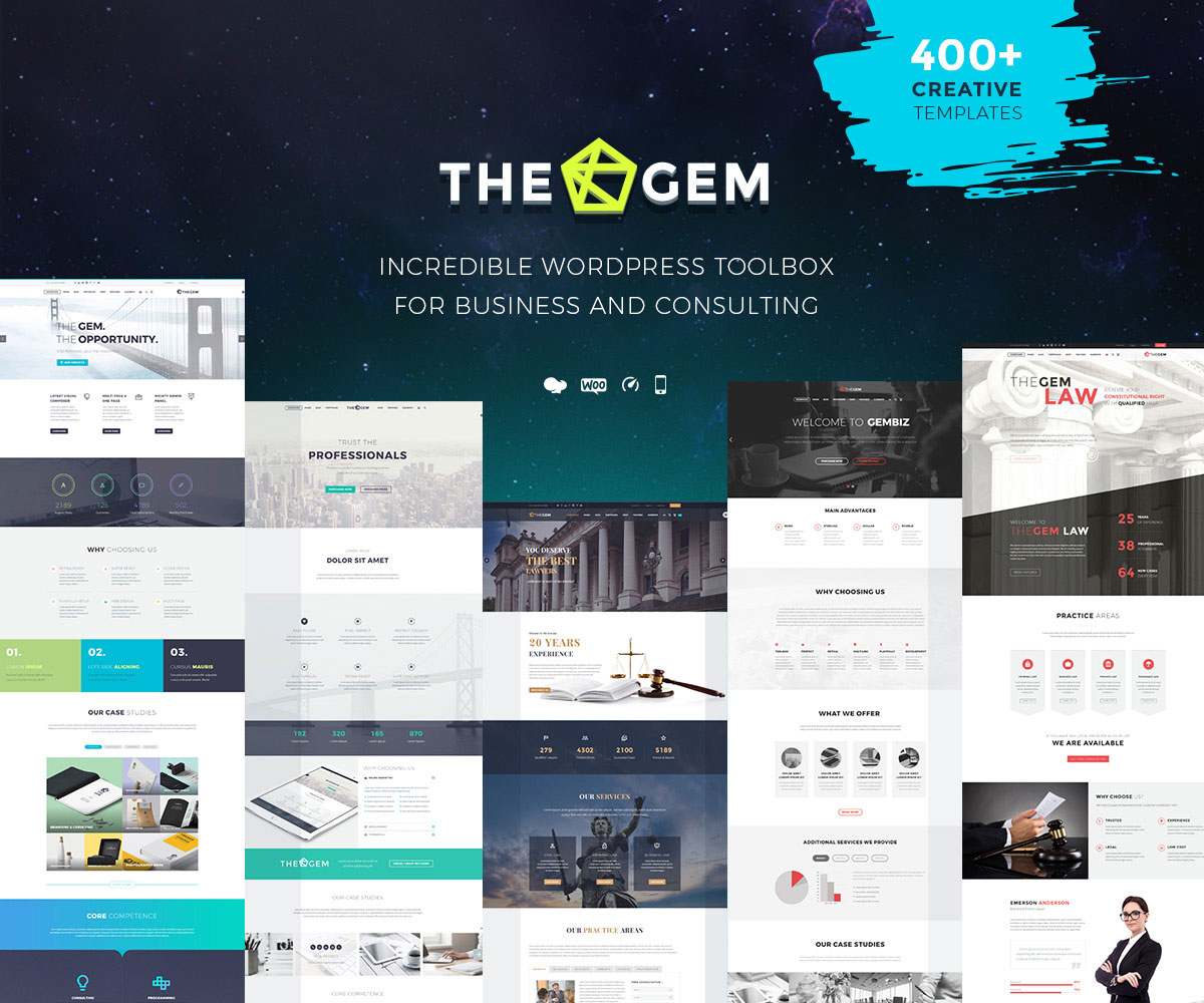 Este tema é uma solução multiuso que se concentra em sites de negócios. Ele vem com um número impressionante de mais de 50 sites prontos para uso que você pode usar para começar a funcionar em questão de minutos. Eles incluem projetos para uma ampla gama de negócios, como clínicas veterinárias, escritórios de advocacia, joalherias e muito mais. Cada demonstração adapta seu design ao setor que visa, mas todas seguem diretrizes de design modernas.