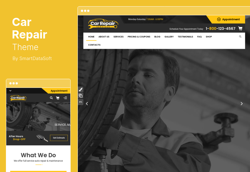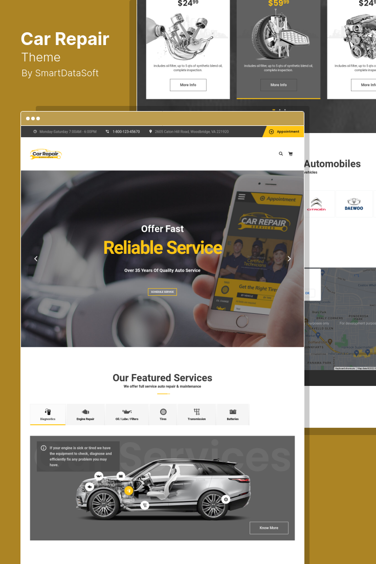 O tema Car Repair foi projetado especificamente para criar sites para oficinas de automóveis e lojas de peças e acessórios de automóveis para conserto de automóveis, estações de lavagem, showrooms de automóveis e centros automotivos significativos.