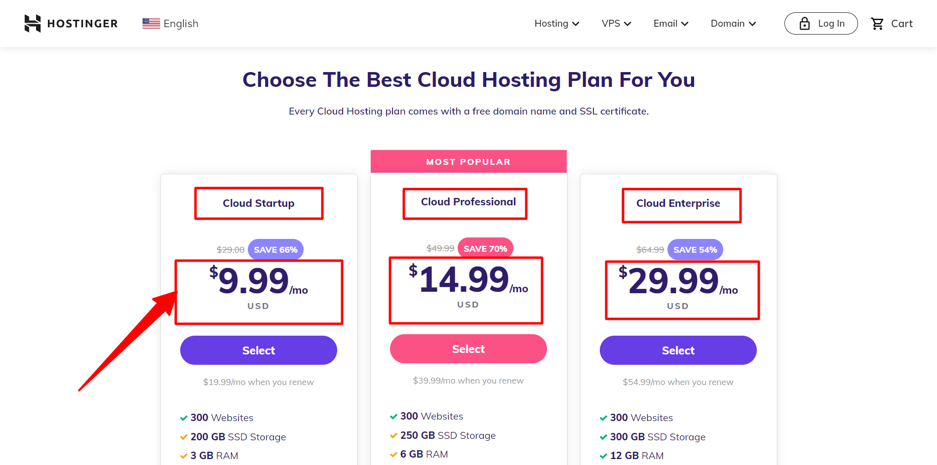 O plano Cloud oferece uma impressionante variedade de recursos, como capacidade para 300 sites, 200 GB de armazenamento, 3 GB de RAM, 2 núcleos de CPU, backups diários e SSL e largura de banda ilimitados. Todos eles vêm com um preço com desconto de até 60%, tornando-o um forte candidato para quem procura um plano de hospedagem acessível e de alto desempenho.