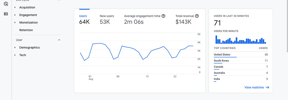 - Dados em tempo real: esse recurso mostra quantas pessoas estão atualmente em seu site, quais páginas elas visitam e quanto tempo permanecem.