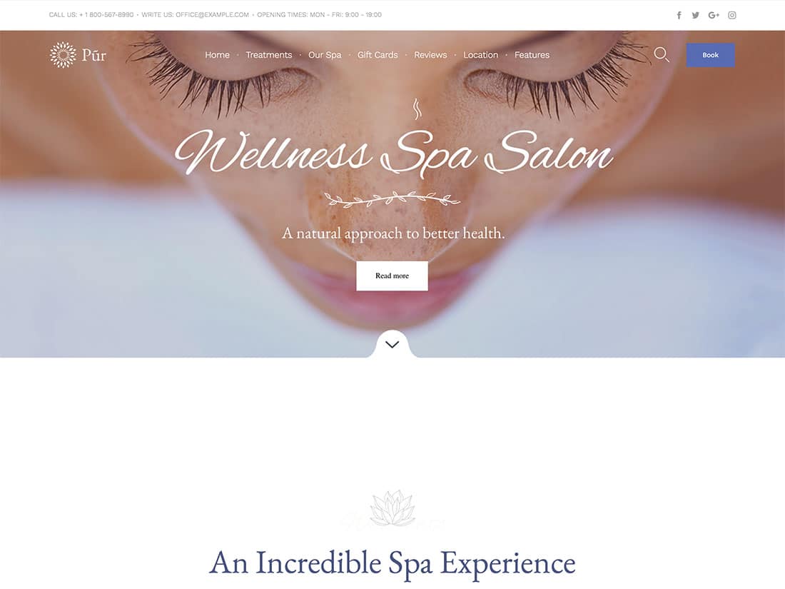 Pur é um tema WordPress completo para spa e salão de beleza com um ótimo design e muitos recursos úteis.