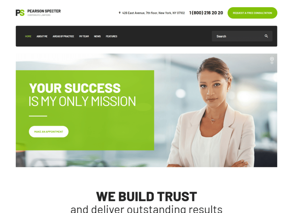 O tema Pearson Specter WordPress é uma solução esplêndida para a criação de escritórios de advocacia, agências de advocacia, empresas de negócios, departamentos jurídicos, agências de advogados, empresas de advogados, empresas de advogados e outros tipos de sites com tópicos específicos. Parece limpo e fácil de usar, fornecendo aos seus clientes padrões de navegação perfeitos e reconhecíveis. O tema é feito com Elementor e permite criar layouts criativos enquanto você arrasta e solta todos os elementos necessários.