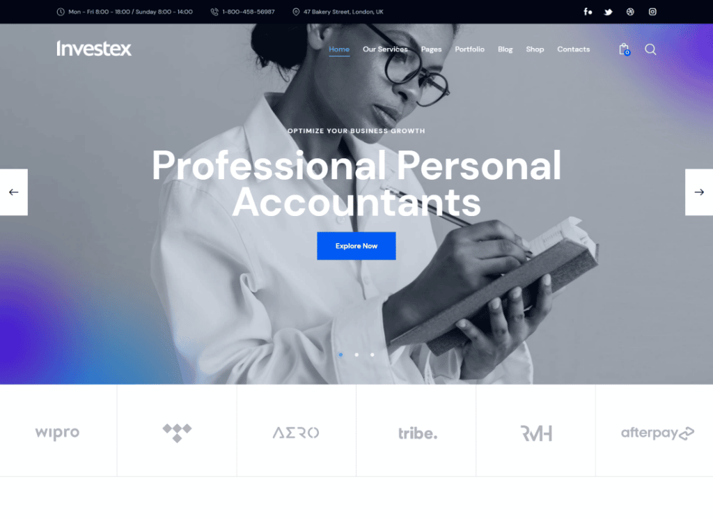 Mais informações / Baixar demonstraçãoInvestex – Tema WordPress de Negócios Corporativos e Contabilidade