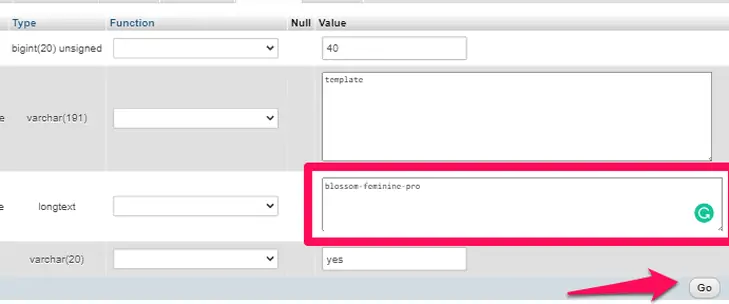 A etapa final é repetir o mesmo processo para a opção de folha de estilo. Clique no botão Editar e cole o nome do tema na linha option_value. Semelhante à opção de modelo, clique no botão Ir depois de fazer as alterações.