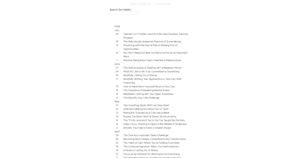 O Zen Habits, site dedicado a artigos sobre wellness e mindfulness, é um excelente exemplo disso. Mesmo que o site atraia milhões de leitores mensais, o design do site é extremamente mínimo. Na verdade, você não encontrará uma única imagem em nenhum lugar.