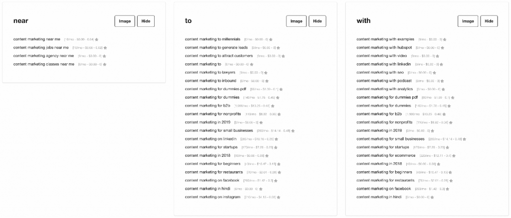 Aqui você pode colocar qualquer tipo de palavra-chave/frase, e o site fornecerá palavras-chave alternativas de cauda longa. As recomendações vêm na forma de perguntas, preposições, comparações e muito mais.