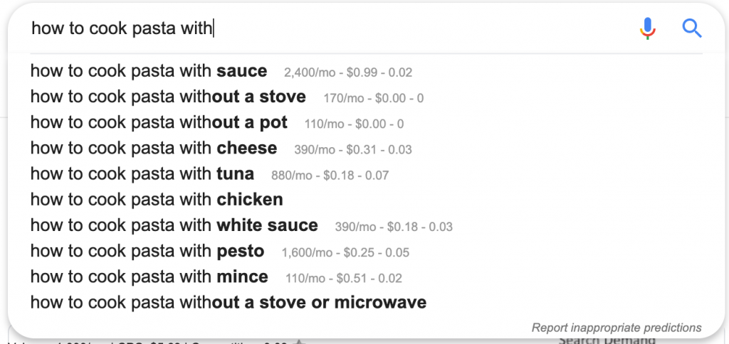 Como você pode ver, as palavras-chave de cauda longa se concentram na profundidade de um tópico e/ou assunto específico. Então, você pode estar se perguntando, onde obter dados sobre palavras-chave de cauda longa? Felizmente, muitos sites agora fornecem essas informações. Na verdade, o próprio Google faz isso por meio de seu recurso de pesquisa de preenchimento automático.