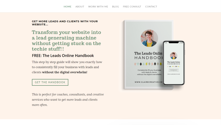Este site foi enviado por Claire Gallagher. A seção hero exibe um manual de CTA com um fundo caloroso e ajuda a descrever do que se trata o site. A próxima seção mostra outro CTA com uma foto do proprietário do site seguida de um depoimento com uma imagem. As postagens do blog são mostradas em uma seção com imagens e os títulos abaixo delas em itálico. Isso cria um design limpo com muitos espaços em branco. Eu gosto de como eles se destacam. Uma seção de depoimentos segue um design semelhante, mas inclui mais texto. A página termina com um CTA de largura total. A página do blog segue o mesmo design limpo da seção do blog da página inicial. A página Work WIth Me foi criada para geração de leads e inclui um design exclusivo para o formulário de reserva e tabelas de preços. Os projetos seguem o mesmo design das postagens do blog.