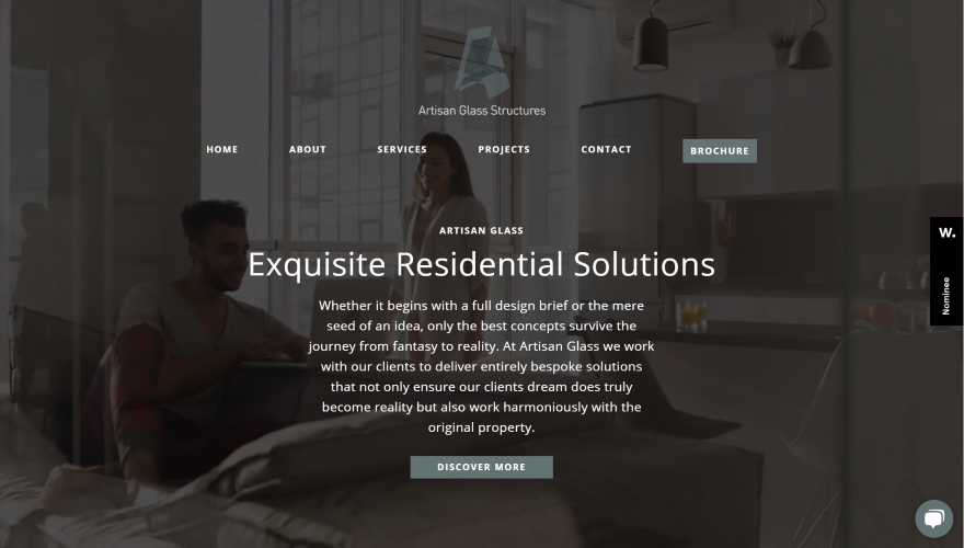 Este site foi enviado por Stuart Hingston. Um vídeo em tela inteira é reproduzido em segundo plano com uma sobreposição escura que destaca o texto. A sobreposição inclui o logotipo e o menu com CTA, título, slogan, descrição e botão. A rolagem revela um cabeçalho fixo e um design semelhante com uma imagem de fundo em paralaxe real. Os serviços e as informações são exibidos em uma faixa estreita com gráficos. Um CTA exibe uma imagem circular em verdadeira paralaxe de um lado. Um controle deslizante de depoimento posiciona o texto sobre as imagens de fundo que servem como exemplos de trabalho. Os serviços mostram imagens altas com texto e botões. Eu amo a seção de projetos. Ele mostra projetos em um layout de várias colunas com divisórias laterais estilizadas e efeitos de zoom para as imagens. Também gosto do formulário de contato que usa campos do mesmo tamanho.