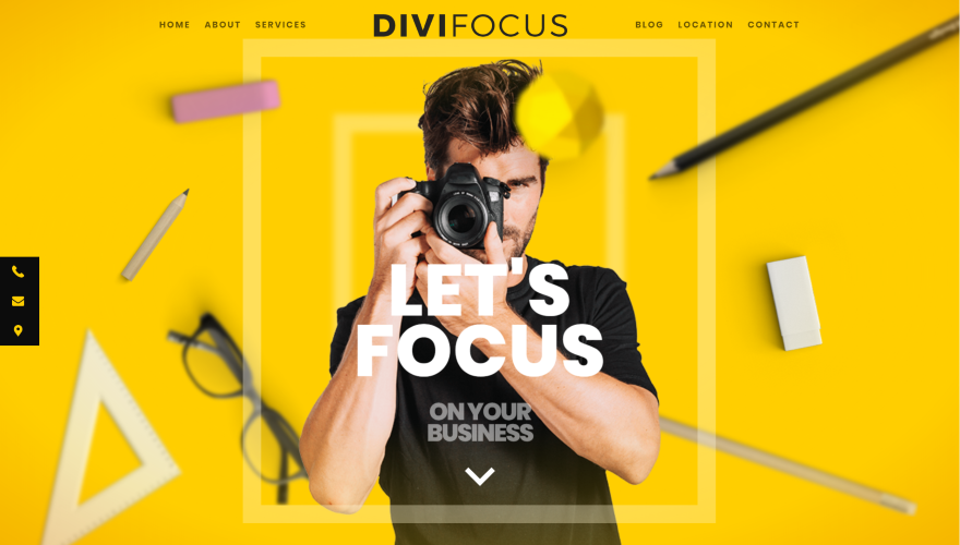 DiviFOCUS foi pensado para qualquer tipo de empresa fotográfica para mostrar os seus serviços. Inclui 10 seções animadas e o plugin Slider Revolution e imagens são incluídos gratuitamente. A seção do herói mostra os elementos em primeiro plano que seguem o seu mouse. Uma seção de sinopses em várias alturas mostra seus serviços. Um CTA é colocado sobre elementos de fundo animados. Uma seção de imagens é sobreposta por um grande módulo de texto. Categorias de fotografia são criadas com imagens e títulos que aparecem ao passar o mouse. Também inclui várias seções Sobre com sinopses, um blog, um mapa e um formulário de contato embutido em um telefone celular. Ele tem botões fixos na barra lateral e muitos efeitos de flutuação.