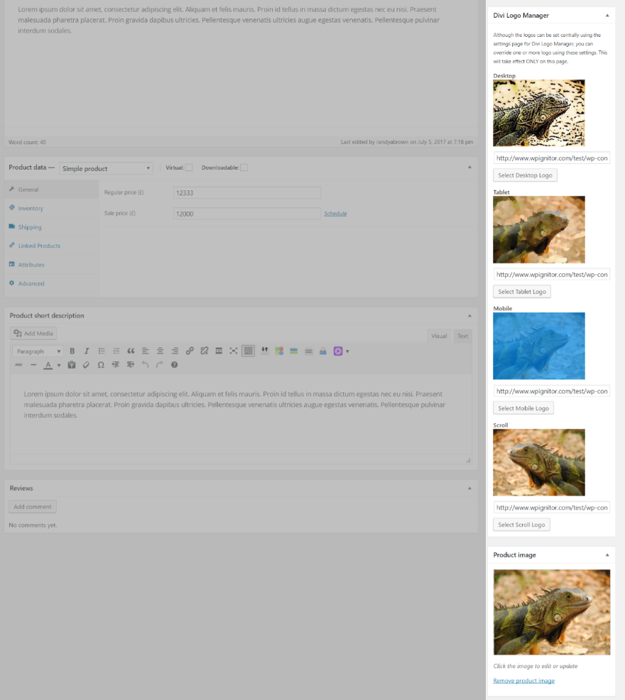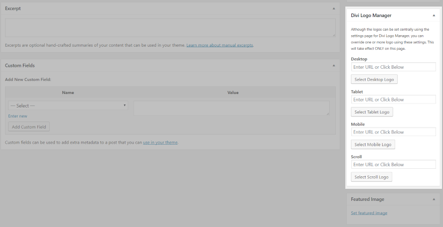 O Divi Logo Manager adiciona um novo conjunto de configurações às suas páginas, projetos e páginas de produtos WooCommerce que permitem que você substitua as configurações definidas no menu principal para que possa escolher um logotipo específico para cada página. Você pode configurá-los para desktop, celular, tablet e rolagem. Isso é ótimo para páginas de destino, ofertas especiais, páginas de portfólio, produtos, etc.