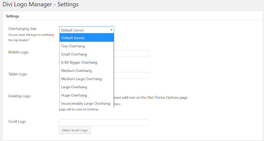 O Divi Logo Manager é direto e simples de usar. Basta selecionar o logotipo que deseja exibir por dispositivo e para rolar e definir a quantidade de saliência. Os logotipos podem ser substituídos para cada página individualmente. Overhang é uma ótima maneira de adicionar algum entusiasmo e fazer seu site se destacar. A saliência pode ser tão oculta ou óbvia quanto você quiser. O recurso de saliência por si só já vale a pena usar o plug-in.