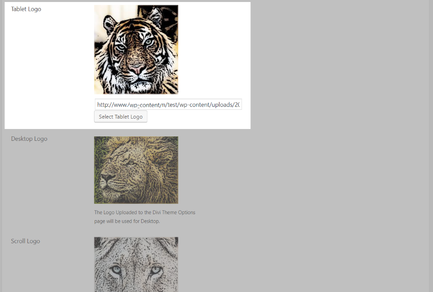 O logotipo da área de trabalho é adicionado nas opções de tema Divi. Todos os outros logotipos são adicionados nesta página ou em cada página individualmente.