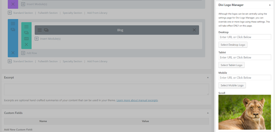 Você pode selecionar um logotipo personalizado que só é exibido em uma página individual de sua escolha. No editor visual, você verá uma nova área de personalização à direita chamada Divi Logo Manager. Aqui você pode selecionar os logotipos para desktop, celular, tablet e rolar por página.