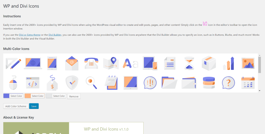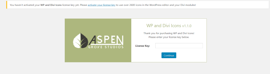 Para chegar à tela independentemente do tema que você está usando, clique no link Instruções na descrição do plug-in na lista de plug-ins. Se você estiver usando Divi, um novo item de menu será adicionado ao menu Divi no painel chamado WP e Divi Icons. Clique aqui e insira sua chave de licença.