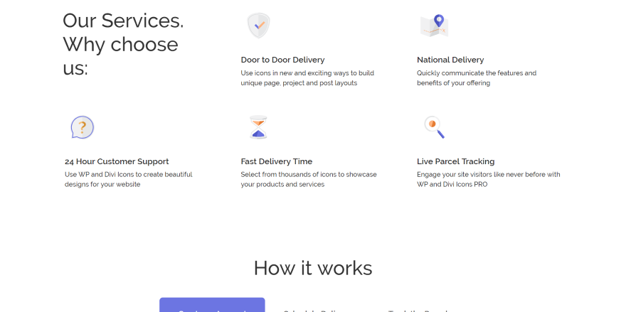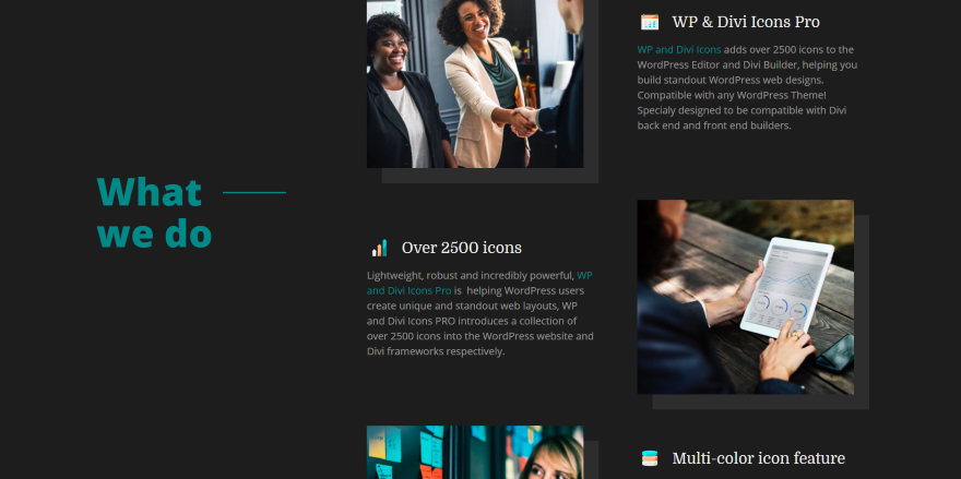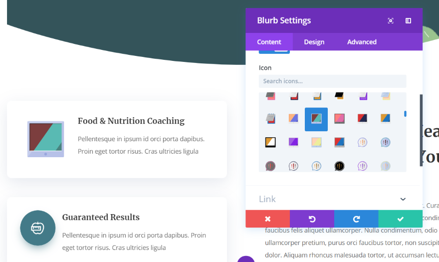 Eu gosto que adiciona Font Awesome e Material Icons, mas meus favoritos são os ícones personalizados - e especialmente os ícones multicoloridos. O editor é simples e divertido de usar. Acho que é um ótimo plugin mesmo sem Divi, mas é ainda melhor com Divi por causa dos layouts gratuitos.