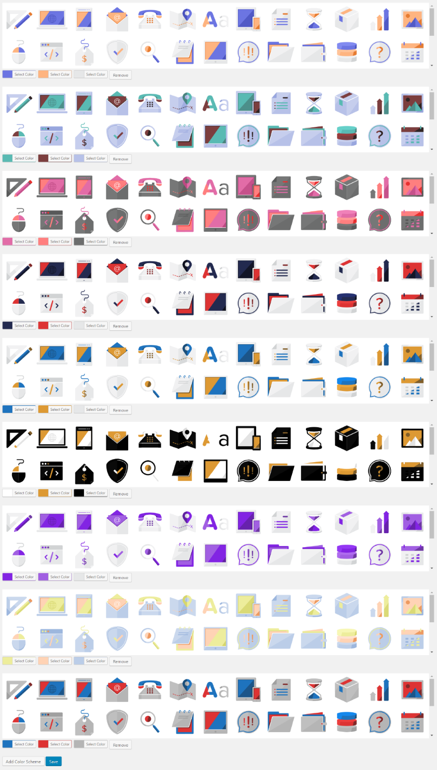 Clicar em Adicionar esquema de cores cria um novo conjunto de ícones multicoloridos que você pode ajustar.