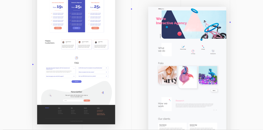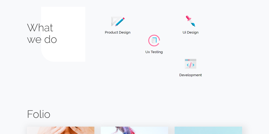 Este inclui um cabeçalho estilizado, uma área sobre os tipos de serviços que você oferece, um portfólio, um controle deslizante que cobre como você trabalha e as etapas que executa, depoimentos, prêmios, sobre sua equipe, contato e rodapé. Ele usa muitos cantos angulares e efeitos de sombra profundos. Os ícones multicoloridos mostram os serviços.