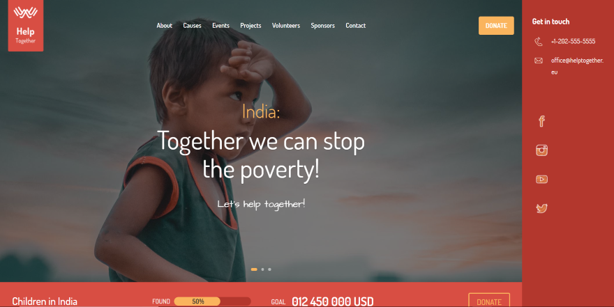 Este exibe um controle deslizante de imagem em tela cheia com um menu vertical à direita e usa ícones para botões de acompanhamento social. Uma pequena seção abaixo mostra um CTA de doação. Também inclui uma seção sobre, causas que você apóia, uma seção de eventos, projetos, sinopses com ícones, patrocinadores e um rodapé.