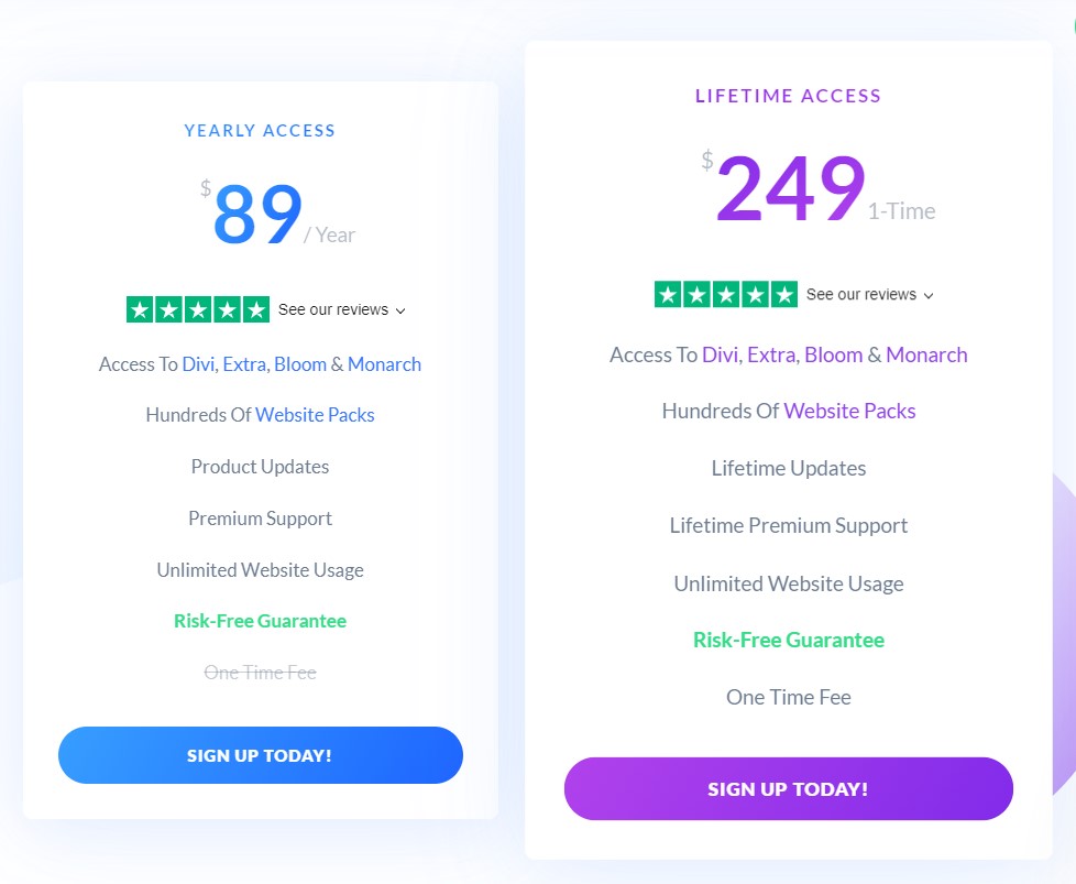 O Divi tem duas opções de preços: acesso anual e acesso vitalício. Você pode pagar US$ 89 por ano pelo plano mais popular ou US$ 249 uma vez por acesso vitalício e atualizações. Ambos os planos incluem acesso a todos os temas (Divi e Extra) e plugins (Bloom e Monarch), atualizações de temas, suporte premium, uso ilimitado do site e garantia sem riscos.