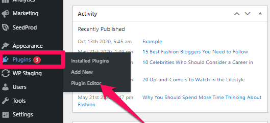 Você pode acessá-lo através de Telas de Administração > Plugins > Editor de Plugins.