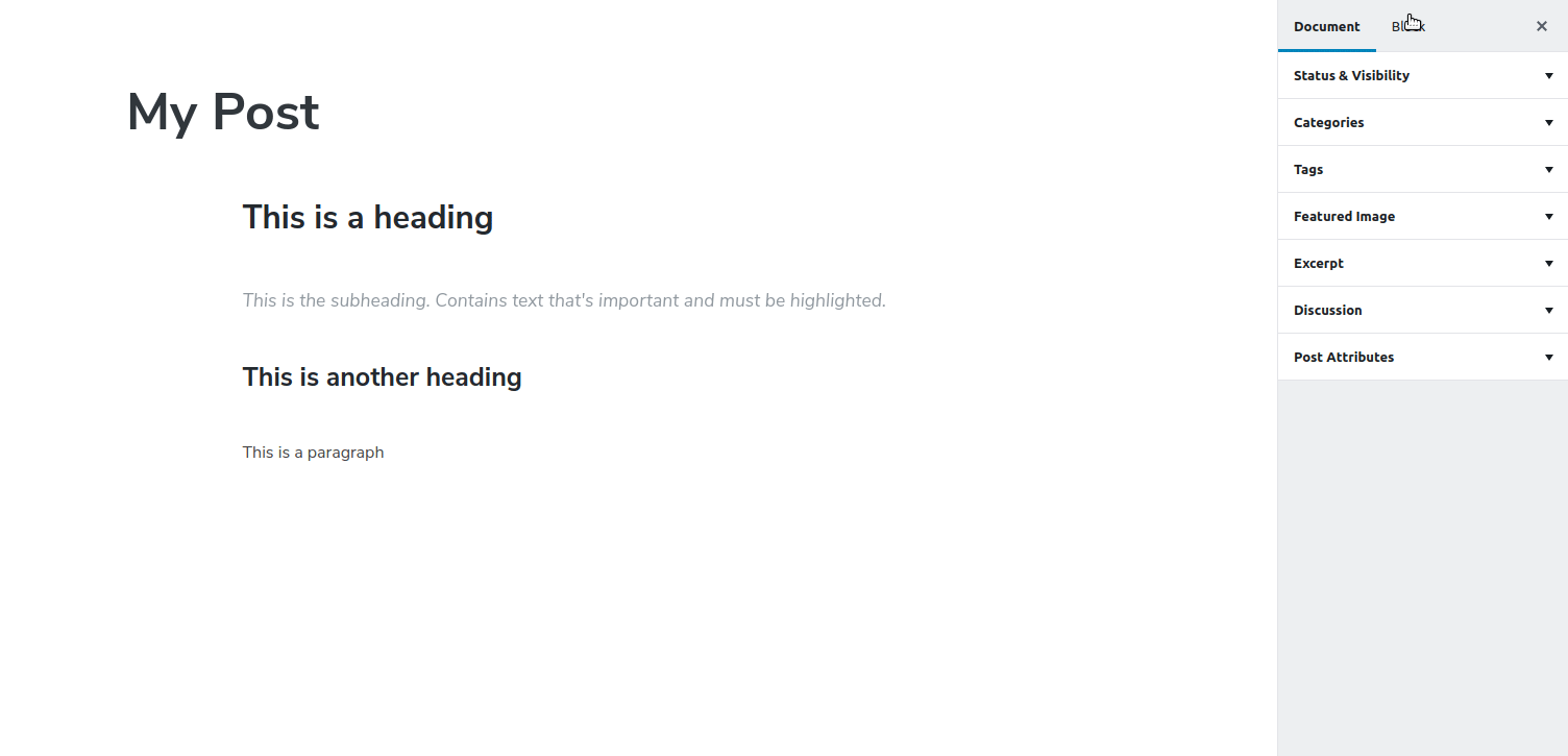 Usando o bloco Headings você pode inserir diferentes Headings, <h1> a <h6>, dentro do seu conteúdo. Depois de inserir vários blocos de título, um Índice fica disponível na barra lateral.