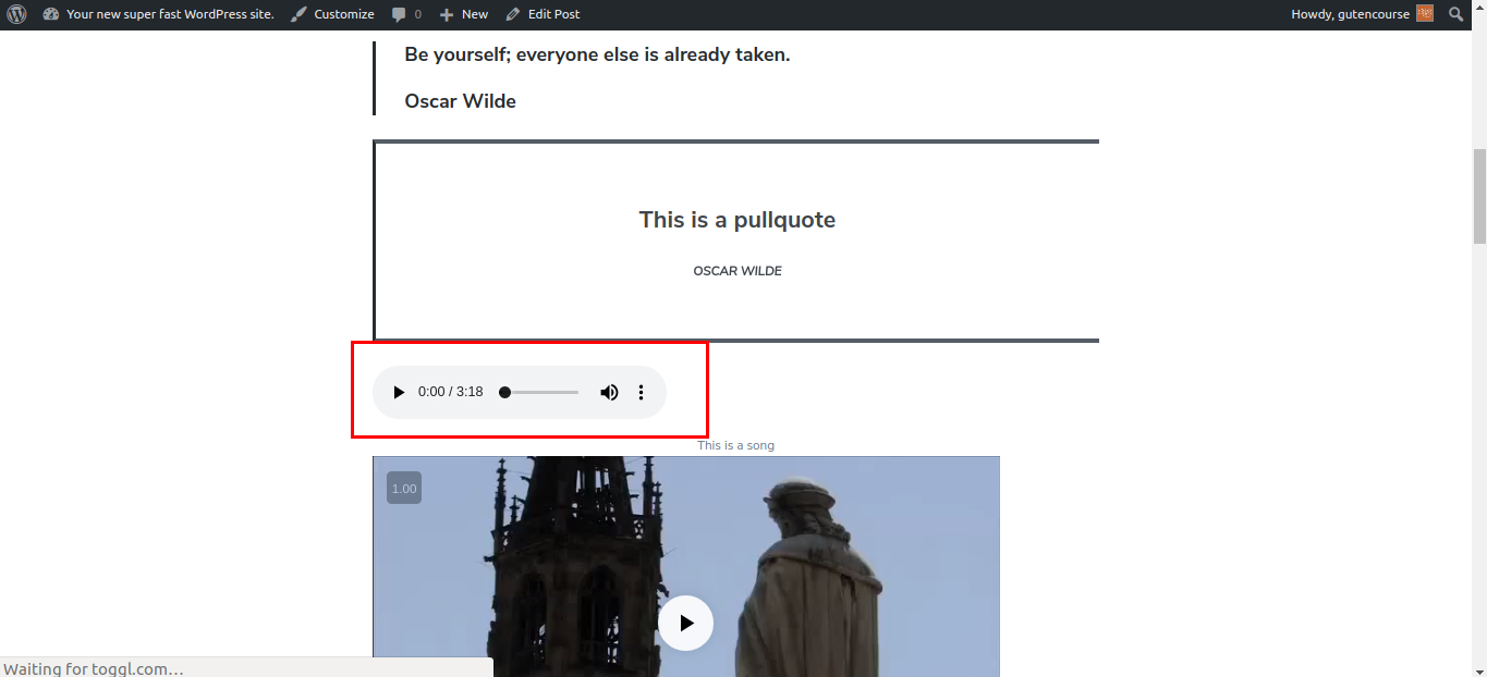 O bloco de áudio fornece um player de áudio HTML nativo simples que pode ser usado para adicionar e reproduzir arquivos de áudio dentro do seu conteúdo. Os arquivos de áudio são armazenados na Biblioteca de mídia.