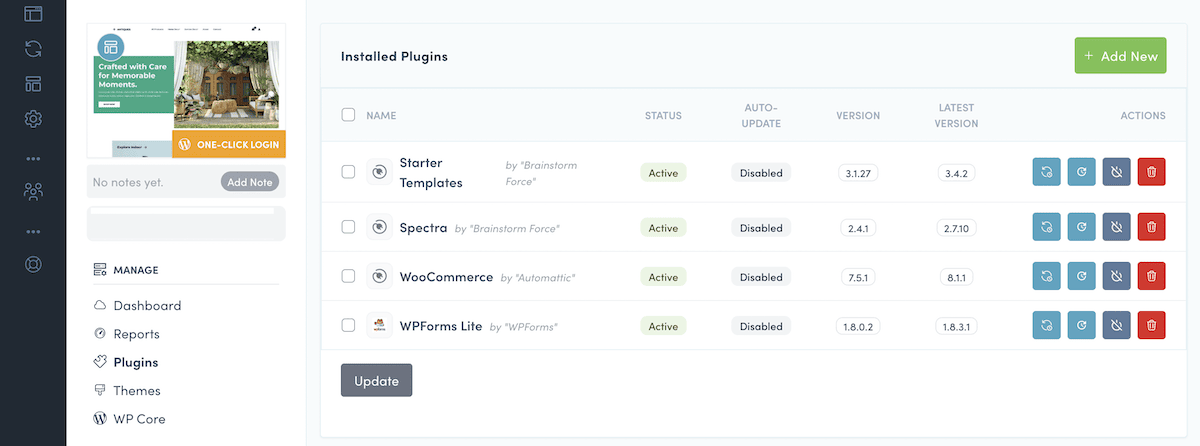 Claro, você precisa tomar cuidado ao atualizar em massa para todos os sites. É por isso que você pode detalhar sites individuais e gerenciar atualizações: