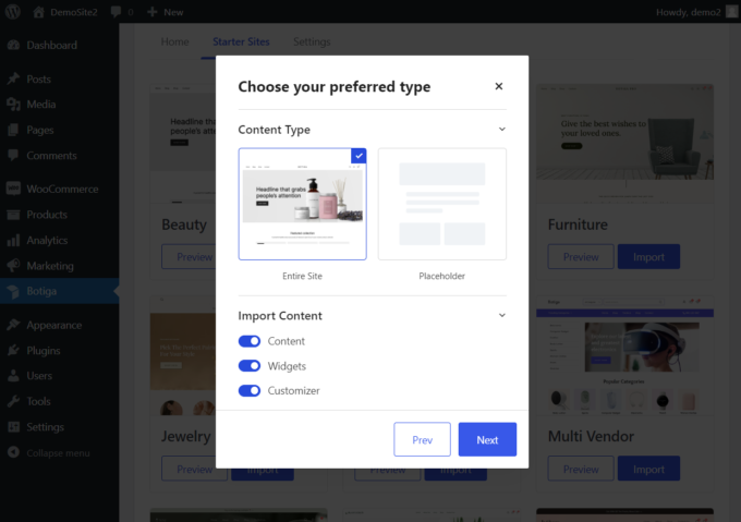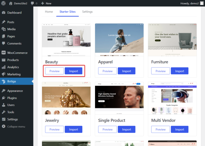 Embora a importação de um site inicial do Botiga seja opcional, e você também pode optar por começar a projetar sua loja do zero usando as opções de personalização do Botiga, recomendo que você vá em frente porque dará à sua loja WooCommerce uma aparência profissional (que você pode ainda mais customizar).