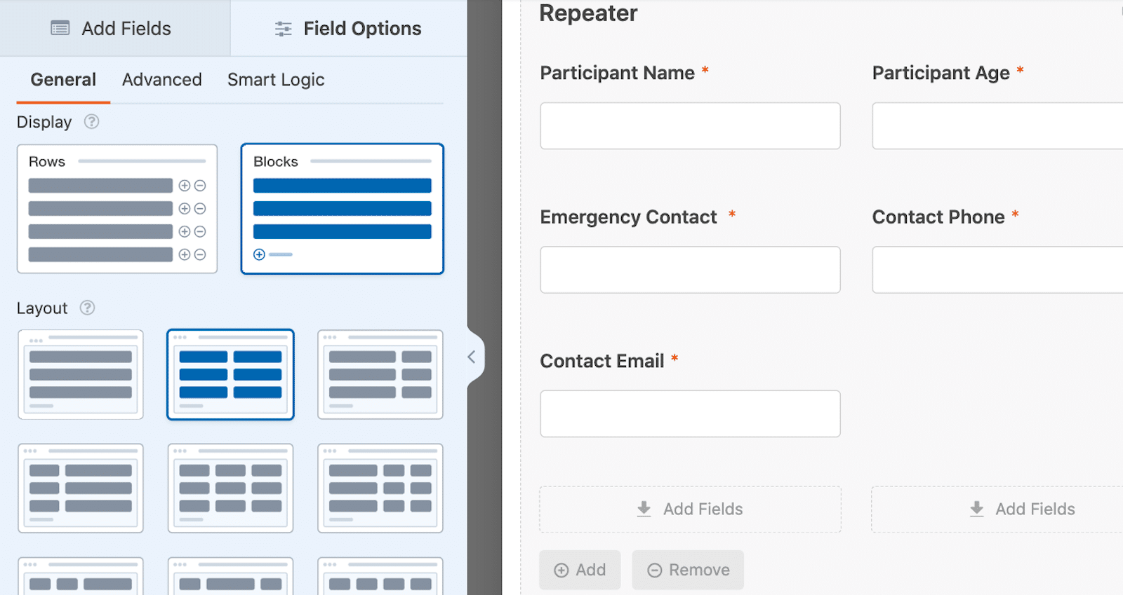 Você não apenas pode personalizar os campos na área do campo Repetidor para serem adicionados como Linhas únicas, mas também pode permitir que blocos inteiros de campos sejam duplicados.
