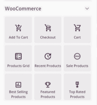 Você encontrará blocos de conteúdo do WooCommerce, como adicionar ao carrinho, checkout, grade de produtos, carrinho e muito mais na seção WooCommerce . Com esses blocos, você pode vender produtos em sua landing page sem problemas.