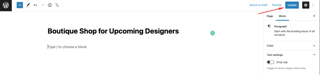 - Agora tudo o que você precisa fazer é inserir um título de página de sua escolha, substituindo o título padrão do WooCommerce. Certifique-se de clicar no botão Atualizar quando terminar.