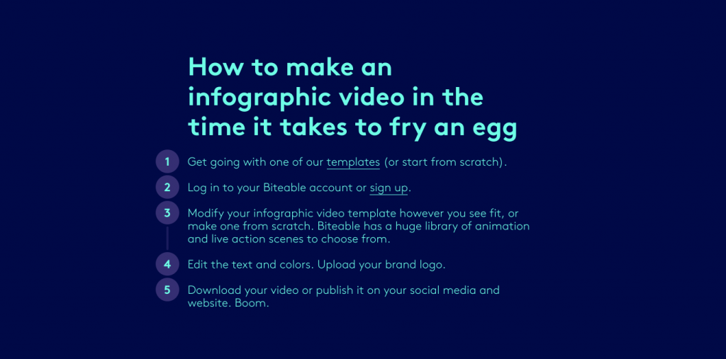 E com o Biteable você terá as ferramentas certas para criar infográficos de vídeo semelhantes. O algoritmo e as opções de layout já estão lá. Tudo o que você precisa é de algumas boas ideias e paciência para digitar todo o conteúdo.