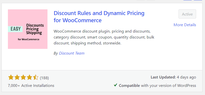 O plug-in Regras de desconto e preços dinâmicos para WooCommerce da Discount Team é um plug-in poderoso e fácil de usar que permite criar vários tipos de descontos percentuais, como:
