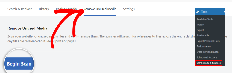 A partir daqui, selecione Begin Scan e pesquise e substitua tudo passará pela sua biblioteca de mídia, identificando quaisquer arquivos que não sejam usados em qualquer lugar do seu site.